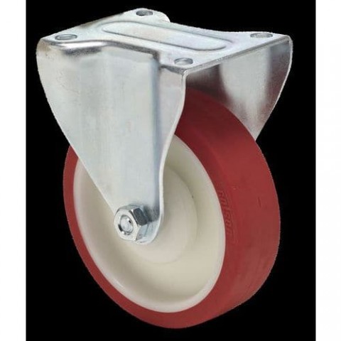 Pevná pojezdová kola s červeným běhounem z polyuretanu. Kolo vyrobené z polyamidu s kuličkovým ložiskem. Běhoun nepoškozuje povrch, nezanechává stopy a má tichý chod. Tvrdost běhounu 96° Shore A.Polyuretanová transportní kola s přírubou, průměr 80 - 125 mm, kuličková ložiska