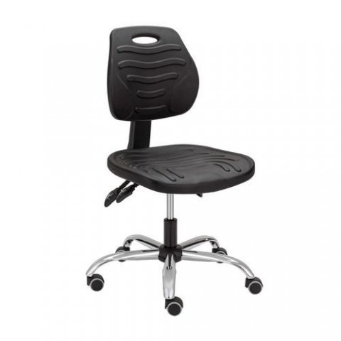 Pracovní židle Softy je vyrobena z vysoce odolného materiálu zabraňující chemickému a mechanickému poškození. Je určena pro průmyslové použití v dílnách, výrobních závodech, potravinářském průmyslu, laboratořích apod. Sedák a opěrák jsou vyrobeny z odolné a na údržbu nenáročné polyuretanové pěny s protiskluzovou úpravou. Ergonomicky tvarovaný opěrák s otvorem pro snadnou manipulaci. Pětiramenný kovový kříž s kolečky na měkké podlahy o průměru 50 mm. Třípakový ovládací mechanismus - asynchronní mechanika.Pracovní židle Softy s tvrdými kolečky