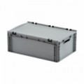 Plastové Euro přepravky mají rovné stěny a modulární rozměry zjednodušující stohování a skladování. Pohodlná madla. Dodáváno včetně odnímatelného víka s plastovými panty. Vyrobeno z polyetylenu.Plastové Euro přepravky PE s víkem