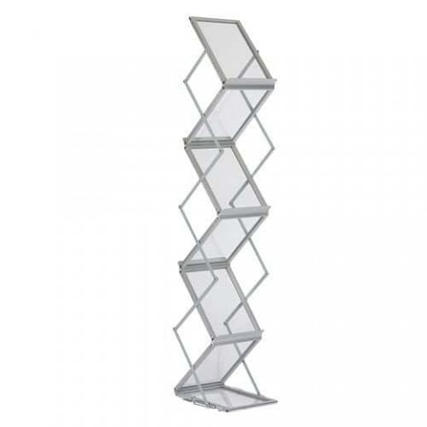 Velmi praktický a odolný skládací stojan. Stojan je vyroben z eloxovaných hliníkových profilů a prostor na prospekty je vyplněn akrylovým sklem. Navržen je tak, aby nabízel dostupnost na letáky a katalogy z obou stran a zároveň, aby zabíral minimum prostoru. K rozložení stojanu stačí pouze vytáhnout směrem nahoru a zajistit ve spodní části stojanu. Rozměr složeného stojanu: 410 x 275 x 110 mm. Rozměr rozloženého stojanu: 350 x 265 x 1 510 mm. Hmotnost: 4,9 kg.Prezentační stojan Twinco, skládací, 5 přihrádek