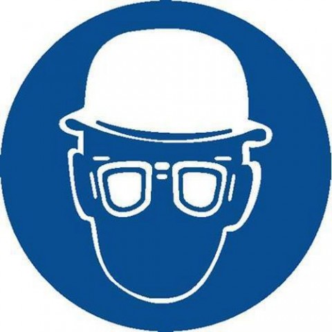 Samolepicí piktogram s bílým podkladem přikazující použití ochranných brýlí.Příkazové bezpečnostní tabulky - Používej ochranné brýle