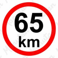Bezpečnostní značka, tabulka nebo samolepka "Omezení rychlosti – 65 km/hod" je tištěna na vysoce kvalitním materiálu, barvami s vysokou odolností proti otěru a UV záření. Provedení plně odpovídá požadavkům právních a technických předpisů. Zejména Nařízení vlády č. 375/2017 Sb., ČSN ISO 3864-1, ČSN ISO 3864-2, ČSN ISO 3864-3, ČSN ISO 3864-4. Kvalitní samolepící reflexní značení nejvyšší povolené rychlosti vozidel. Je určeno pro vozidla kategorií M2, M3, N2, N3, O, OT, S . Podle vyhl. č. 341/2014 Sb musí mít na zádi karoserie v levé polovině vyznačenou nejvyšší povolenou rychlost z retroreflexního materiálu třídy 1 podle ČSN EN 12899-1. Není-li možno u přípojných vozidel kategorie O1, O2, R, vozidel kategorie S, jednonápravových traktorů s přívěsem a speciálních nosičů pracovních adaptérů umístit označení o průměru 200 mm, je přípustné použít označení o vnějším průměru 150 mm. Samolepka průměru 150 nebo 200 mm s označením nejvyšší povolené rychlosti v provedení z retroreflexní fólie třídPříkazové tabulky - Omezení rychlosti 65 km/h
