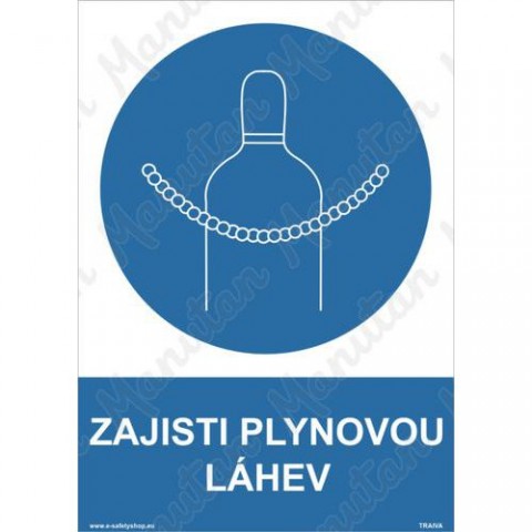 Bezpečnostní značka, tabulka nebo samolepka "Zajisti plynovou lahev" je tištěna na vysoce kvalitním materiálu, barvami s vysokou odolností proti otěru a UV záření. Provedení plně odpovídá požadavkům právních a technických předpisů, zejména Nařízení vlády č. 375/2017 Sb., ČSN ISO 3864-1, ČSN ISO 3864-2, ČSN ISO 3864-3, ČSN ISO 3864-4.Příkazové tabulky - Zajisti plynovou lahev