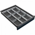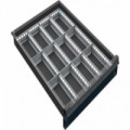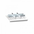 Dělicí příčky pro zásuvkové skříně umožňují rozdělení zásuvek na dvanáct přihrádek. Příčky jsou vyrobeny z 1,5mm hliníkového plechu. Štěrbinové dělení z plechu Zn. Určeno pro zásuvky s čelem o výšce 10 a 12,5 cm.Dělicí příčky