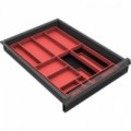 Dělič zásuvky je vyroben z odolného ABS plastu. Několik přihrádek je navíc opatřeno molitanem pro citlivější nástroje (černě zabarvené dno přihrádky). Přihrádky nejsou přestavitelné. Pro zásuvky dílenských kontejnerů s půdorysem š x h 500 x 700 mm a výškou 60 - 120 mm. materiál: ABS plast typ: příčné/podélné rozměry v x š x h: 3,5 x 36 x 55 cm barva: červenáDělicí příčky