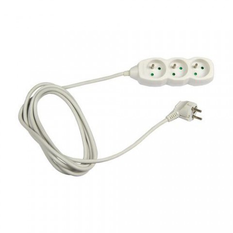 Prodlužovačky se třemi zásuvkami v několika délkách. Slouží pro prodloužení elektrické energie tam, kde pevná zásuvka nedosáhne. Vyrobené z plastu v bílém provedení.Prodlužovací kabel Emos, 3 zásuvky, 1,5 - 5 m