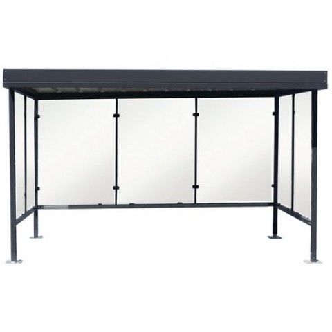 Přístřešky se skleněnou výplní vhodné pro suché stání kol, kuřácký koutek nebo lze použít jako čekárnu. Výplň tvoří bezpečnostní tvrzené sklo tl. 5 mm. Ocelová plechová střecha se zajištěným odtokem dešťové vody pomocí PE žlabů. Konstrukce vyrobená z pozinkovaných ocelových profilů 60 x 60 x 2 mm. Montážní šrouby z nerezové oceli třídy A2. Povrchová úprava termosetovou polyesterovou barvou vypálenou při 200 °C, která odolává UV záření. Čtyři nohy na platformě 200 x 200 x 5 mm, kterou lze připevnit k zemi. Pro připevnění k betonovému základu použijte kotevní šrouby M12/65, na čistý rovný asfalt použijte závitové tyče M12/120 (minimální tloušťka asfaltu 7 cm).Prosklené přístřešky Manutan Expert Beaulieau, délka 7,6 m