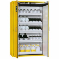 Žluté bezpečnostní skříně na skladování hořlavých látek s vnitřním vybavením z polypropylenu. Dveře jsou zavěšené na třech pantech, některé skříně jsou vybavené pojistkou dveří, kdy při otevření zůstávají v poloze a automaticky se uzavírají v případě požáru. Kvalitní kovová konstrukce ošetřená práškovým lakem (RAL 1004). Uzamykatelné dveře cylindrickým zámkem. Integrovaný systém pro připojení ventilace (DN 75). Jednotlivé varianty se liší typem vybavení a dveřmi s pojistkou.Protipožární skříně na hořlaviny Asecos, 1968 x 1196 x 616 mm, vybavení PP, žluté