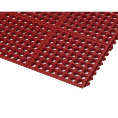 Únavová rohož je vhodná pro vysoce frekventované prostředí v potravinářství a gastronomii. Materiál je odolný vůči mazadlům, rostlinným olejům a živočišným tukům. Díry umožnují odvod vody z povrchu. Jednotlivé dlaždice lze spojovat. Možno doplnit o náběhové hrany.Protiúnavová gastro rohož s děrovaným povrchem, 91 x 91 cm