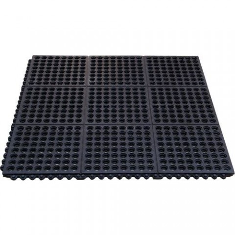 Protiúnavová rohož v provedení s děrami je vhodná pro frekventované provozy. Dlaždice jsou opatřeny kolíky na dvou stranách a otvory na dalších dvou, pomocí kterých se rohože připevňují k sobě. Rohož odolává krátkodobému působení olejů, tuků, teplotám do 160 °C i rozlití roztaveného skla.Protiúnavová průmyslová rohož s děrovaným povrchem, 90 x 90 cm