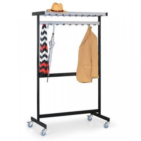 Řadový stojanový věšák s odkládací policí v oboustranném provedení s kolečky. Vhodný do kanceláří, přístupových hal a předsíní. Konstrukce věšáku je vyrobena z hranatých ocelových trubek o rozměrech 50 x 20 mm. Horní rošt je tvořen z trubek o průměru 22 mm. Povrchová úprava práškovým lakem.Řadový stojanový věšák Wyatt s odkládací policí