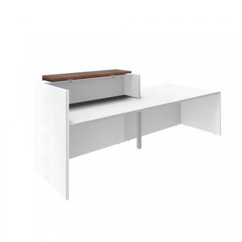 Moderní recepce Luxo v bílé barvě. Desky mají antireflexní povrch odolný proti poškrábání a 2 mm ABS hranu. Vybaveno rektifikačními nožkami pro eliminaci podlahových nerovností. barva: bílá/ořech rozměry pracovní desky d x h: 286 x 88 cm výška pracovní desky: 113 cm provedení: snížené vlevo materiál: laminovaná dřevotříska 2 mm ABS hrana, desky tloušťky 25 mm, dodáváno v demontovaném stavuRecepce Luxo snížená vlevo, 286 cm