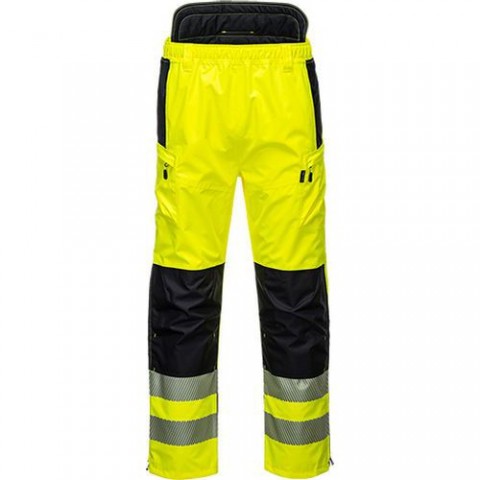 Vysoce prodyšné a voděodolné pracovní kalhoty s reflexními pruhy. Celkem 8 kapes pro ukládání věcí, lepené švy. Kapsy na kolena pro chrániče, polstrovaný zadní pás pro bezpečné a pohodlné nošení. Vyrobeno ze 100% polyesteru, PU zátěr 200 g. Splňují normy EN ISO 20471 Třída 2; EN 343:2019 Třída 4:3 X 11,000MM, MVP 50,000 G/M2/24HRS; ANSI/ISEA 107-2015 SUPPLEMENTAL Třída E.Reflexní kalhoty PW3 Extreme Hi-Vis, černé/žluté