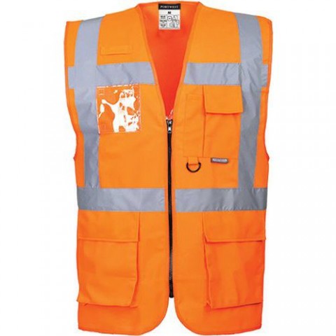 Vesta s nízkou hmotností, reflexními prvky a výrazně oranžovou barvou je vhodná i do železničního průmyslu. Vybavená je smyčkou na radiostanici, dvojitým držákem ID karty, očkem pro připevnění např. klíčů, dvěma velkými a dvěma malými kapsami. Přední zapínání na zip. Tkanina 100% polyester, Warp Knit 125 g/m2. Splňuje normy EN ISO 20471 Třída 2, AS/NZS 4602.1:2011 Třída D/N, ANSI/ISEA 107-2015 TYP R Třída 2 a RIS-3279-TOM Vydání 1.Reflexní manažerská vesta Berlin Hi-Vis, oranžová