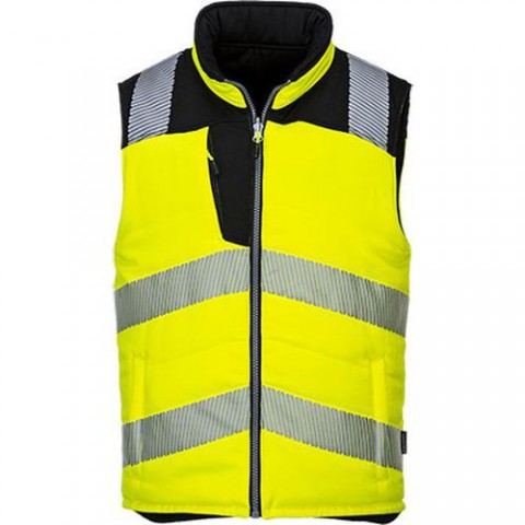 Zateplená vesta s výrazně žlutou barvou a reflexními doplňky zvyšuje viditelnost nositele. Díky oboustrannému využití lze oděv využít jak v práci tak i pro volný čas. Součástí je kapsa na mobilní telefon, kroužek pro připevnění např. klíčů a dvě boční kapsy na zip. Dobrou izolaci zajišťuje prošitá podšívka. Přední oboustranné zapínání na zip. Tkanina 65% polyester, 35% bavlna 245 g/m2, podšívka Insulatex 300 g/m2. Splňuje normy EN ISO 20471 Třída 2 a ANSI/ISEA 107 TYP R Třída 2.Reflexní oboustranná vesta PW3 Hi-Vis, žlutá/černá
