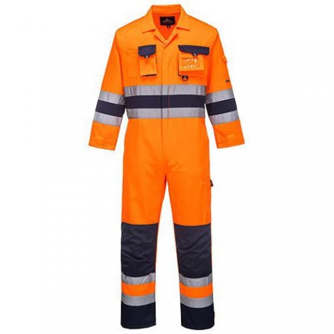 Pracovní overal s reflexními prvky pro vysokou viditelnost. Celkem 12 kapes pro uložení věcí, nastavitelné manžety na rukávech a lem na nohavicích na suchý zip. Elastická zadní část, kolenní vložky. Tkanina odráží 98 % UV záření (50+ UPF). Vyrobeno z kombinovaného materiálu 65% polyesteru a 35% bavlny 245 g. Splňuje normy RIS-3279-TOM ISSUE 1; EN ISO 20471 Třída 3.Reflexní pracovní kombinéza Nantes Hi-Vis, oranžová/modrá