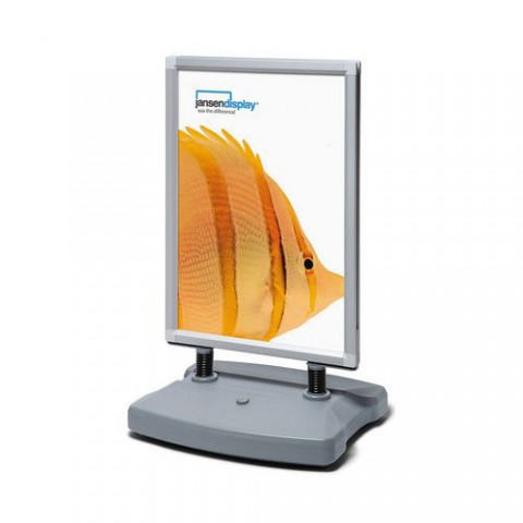 Reklamní oboustranné tabule jsou vhodné pro prezentaci ve venkovním prostředí. Plastové základny vybavené kolečky jsou plnitelné vodou či pískem. Reklamní poutače mají vyztužené pružiny z vysoce kvalitní oceli a nárazuvzdorné středové panel. Stojany disponují bezpečnostními plastovými rohy.Reklamní stojany Windtalker City, šedé