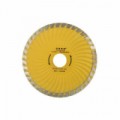 Diamantový řezný kotouč turbo pro hluboké řezání tvrdých stavebních materiálů za sucha. Rozměry 125x22m. S nepřerušovaným diamantovým segmentem a prolamováním po celém obvodu. Díky prolamování turbo kotouč chladí lépe než obyčejný celoobvodový. Lépe vynáší obroušený materiál z řezu ven a řezání je rychlejší, avšak může docházet ke štípání hran a výsledný řez je širší.Diamantový řezný kotouč, TURBO PLUS, 125x22m GEKO