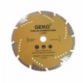Kvalitní diamantový turbo-segmentový řezný kotouč GEKO s rozměry 230 x 8 x 22mm vhodný pro hluboké řezání tvrdých stavebních materiálů za sucha i mokra. S přerušovaným diamantovým segmentem (s drážkami, výřezy), který je rozdělený na určitý počet užších segmentů a prolamováním po celém obvodu. Díky segmentům a prolamování tento kotouč chladí lépe jak ostatní kotouče, lépe vynáší obroušený materiál z řezu ven a řezání je rychlejší, avšak může docházet ke štípání hran a výsledný řez je širší. Turbo-segmentový kotouč se hodí pro hluboké řezání tvrdých stavebních materiálů jako je např. beton, železobeton, asfalt, zdivo, kámen, zámkový dlažba apod.Diamantový řezný kotouč, 230x22mm GEKO