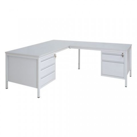Kovový rohový stůl s dvouzásuvkovým a třízásuvkovým kontejnerem. Zásuvky lze plně vysunout. Rám z kovových profilů je povrchově upraven práškovou barvou. barva desky: světle šedá rozměry desky d x h: 160 x 80; 120 x 60 cm výška stolu: 76 cm provedení: levé rohové materiál desky: laminovaná dřevotříska, tl. 18 mm materiál podnoží: ocelové trubky, tl. 1,5 mm barva kontejneru: světle šedá RAL 7035 barva podnoží: světle šedá RAL 7035 počet kontejnerů: 2 rozměry kontejneru v x š x h: 53 x 46,1 x 60 cm počet zásuvek kontejneru: pravý 3; levý 2 dodáváno v demontovaném stavu (spojovací materiál součástí balení) snadná montážRohový kancelářský stůl se dvěma kontejnery Basic, 200 x 160 cm, levé provedení