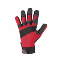 Kombinované pracovní rukavice z jemné a pevné syntetické kůže. Pro větší komfort je hřbet rukavice vyroben ze strečového a přizpůsobitelného Spandexu a oblast kloubů z neoprenu. Silikonový potisk dlaně a prstů zlepšuje uchopení předmětu.Rukavice CXS Shark ze syntetické kůže, červené/černé