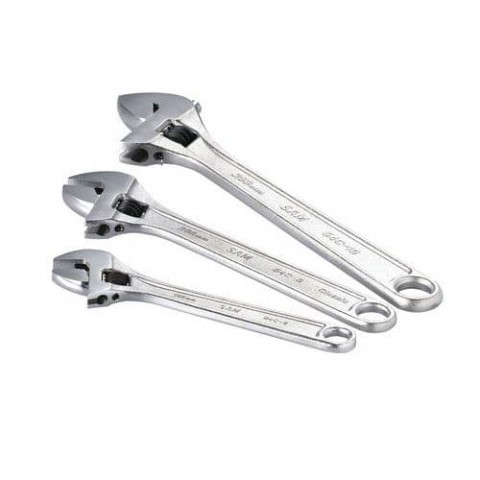 Sada 3 chromovaných klíčů: 6, 8 a 10 palců. Hlava nakloněná pod úhlem 15o. Západkový systém čelistí nevyčnívá.Sada 3 nastavitelných klíčů 6, 8 a 10 palců