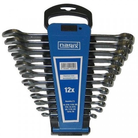 Kované,chrom-vanadová ocel Povrchová úprava matný chrom Plastový držák Obsahuje () 1/4;5/16;11/32;3/8;7/16;1/2;9/16;5/8;11/16;3/4;13/16;7/8Sada klíčů 12dílná inch očkoplochých plast. držák, NAREX 443000731