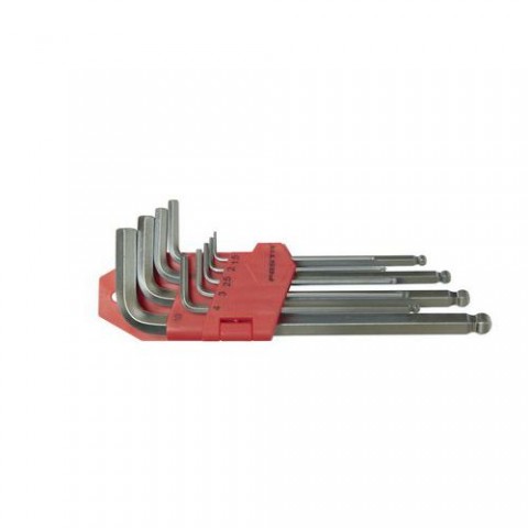 Sada devíti šestihranných klíčů imbus s hlavičkou v L profilu. Kuličková hlava na delší straně klíče umožňuje práci s imbusovými šrouby i pod úhlem. Klíče jsou zasunuty v pouzdře ve dvou řadách.Sada klíčů imbus s hlavičkou, 9 ks