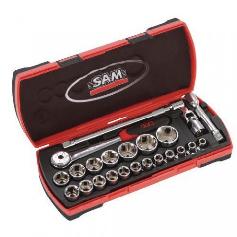 Sada 23 ks nástrčných klíčů. Kované objímky z chrom-vanadové oceli. Lesklý leštěný chromovaný povrch.Sada nástrčných klíčů 1/2 Sam, 23 ks