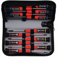Otočná hlava s ovládáním dlaní zajišťuje maximální účinnost. Výborná přilnavost. Přesné hrany chrání šrouby před poškozením. Odolná čepel. Velikosti a hlavy jsou označeny pro okamžitou identifikaci šroubováků.Sada přesných šroubováků, 12 šroubováků