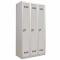 Třídveřové svařované šatní kovové skříně. Díky snížené výšce jsou vhodné i pro žáky prvního stupně. Vyrobeny z ocelového plechu s povrchovou úpravou práškovým lakem. Skříně jsou vybaveny dvěma policemi na knihy, policí na boty a součástí jsou také 2 háčky na oblečení. Větrací mřížky ve dveřích, úhel otevření dveří s bezpečnostní pojistkou max. na 90°, samolepicí štítek na jméno, možnost dokoupení horního šikmého nástavce. Uzamykání cylindrickým zámkem se dvěma klíči.Snížené školní šatní skříně, 3 sloupce, 300 mm, cylindrický zámek