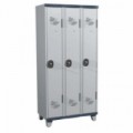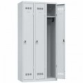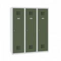 Třídveřové šatní skříně se sníženou výškou. Vhodné do škol pro žáky prvního stupně. Vyrobeny z ocelového plechu s povrchovou úpravou práškovým lakem. Skříně jsou vybaveny dvěma policemi na knihy, policí na boty a součástí jsou také 2 háčky na oblečení a samolepící jmenovka na dveřích. Větrací mřížky ve dveřích, úhel otevření dveří s bezpečnostní pojistkou max. na 90°, samolepicí štítek na jméno, možnost dokoupení horního šikmého nástavce. Uzamykání cylindrickým tříbodovým zámkem.Snížené školní šatní skříně, 3 sloupce, 400 mm, tříbodový cylindrický zámek