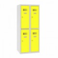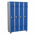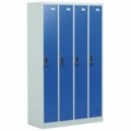 Svařované šatní skříně se čtyřmi oddíly vhodné do škol. Díky snížené výšce jsou ideální i pro žáky prvního stupně. Vyrobeny z ocelového plechu s povrchovou úpravou práškovým lakem. Skříně jsou vybaveny dvěma policemi na knihy a háčkem na oblečení. Větrací mřížky ve dveřích, úhel otevření dveří s bezpečnostní pojistkou max. na 90°, samolepicí štítek na jméno, možnost dokoupení horního šikmého nástavce. Uzamykání cylindrickým zámkem se dvěma klíči.Snížené školní šatní skříně, 4 oddíly, 300 mm, cylindrický zámek