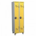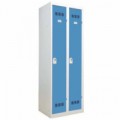 Dvouoddílové svařované šatní skříně se sníženou výškou. Vhodné do škol pro žáky prvního stupně. Vyrobeny z ocelového plechu s povrchovou úpravou práškovým lakem. Skříně jsou vybaveny dvěma policemi na knihy, policí na boty a součástí jsou také 2 háčky na oblečení a samolepící jmenovka na dveřích. Větrací mřížky ve dveřích, úhel otevření dveří s bezpečnostní pojistkou max. na 90°, samolepicí štítek na jméno, možnost dokoupení horního šikmého nástavce. Uzamykání cylindrickým tříbodovým zámkem.Snížené školní šatní skříně, 2 sloupce, 300 mm, tříbodový cylindrický zámek