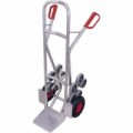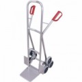 Hliníkový rudl na schodiště pro přepravu břemen. Tříramenná hvězdicová kola z šedé termoplastické pryže na plastovém ráfku. Rozměry lopaty 480 x 300 mm. Svařovaná konstrukce. Plastová madla s bezpečnostní ochranou zamezující poranění rukou.Schodišťový rudl RU222, do 200 kg, 62 x 67,5 x 131 cm
