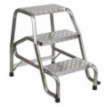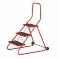 Ocelové pojízdné schůdky vhodné do skladů, archivů a knihoven. Materiál stupňů z protiskluzové a voděodolné dřevotřísky, vzdálenost mezi stupni je 21,5 cm. Mobilitu zajišťují 2 kolečka o průměru 125 mm. Povrchová úprava práškovým lakem RAL 3000.Pojízdné ocelové schůdky s plošinou, 3 stupně