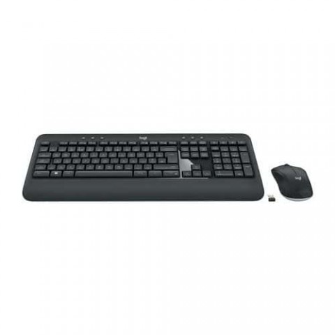 Souprava počítačové myši a klávesnice s bezdrátovým připojením a s dosahem až 10 m. Konstrukce klávesnice je odolná vůči polití, tichý chod kláves, možnost nastavení tří poloh sklonu. Myš s plynulým optickým snímáním, 3 ovládací tlačítka. Připojení pomocí USB přijímače. Napájení klávesnice 2x AA baterie, myš 1x AA baterie. Rozměry myši 61,8 x 39,2 x 11,5 mm.Set bezdrátové klávesnice a myši Logitech MK540, CZ/SK, černý
