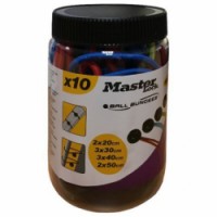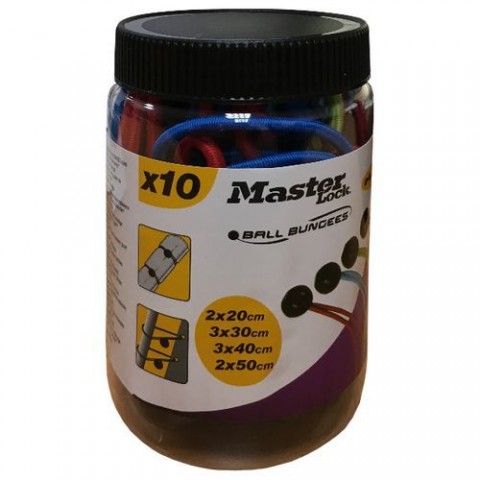 Set 10 ks upínacích gum zakončených kuličkou. Set obsahuje upínací gumy 2 x 200 mm, 3 x 300 mm, 3 x 400 mm a 2 x 500 mm, všechny o průměru 4 mm. Barevně odlišené délky gum (200 – 500 mm).Set upínací gumy s kuličkami Master Lock, 10ks