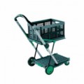 Vozík s pevnou hliníkovou konstrukcí lze složit stisknutím tlačítka na madle. Přepravku je možné zajistit řemínkem. Vozík je opatřen brzdou proti pojezdu. Pohyb zajišťují dvě pevná a dvě otočná kola.Skládací vozík s přepravkou