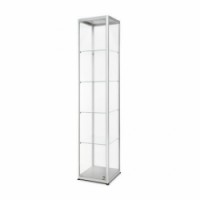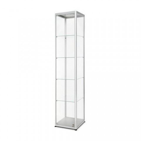 Prosklené produktové vitríny s LED osvětlením v několika rozměrech. Vitríny jsou uzamykatelné a obsahují čtyři skleněné police. Vyrobené z ESG skla 4 mm a hliníku, umístěné na čtvercové podstavě. Vhodné použití jako vitríny do obchodů nebo jako výstavní vitríny.Skleněné produktové vitríny Dekor s osvětlením