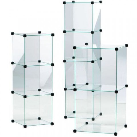 Ideální jako odkládací stolek nebo prvek na stěnu, případně jako elegantní stojan na výrobky. Jednotlivé moduly umožňují rychlé sestavení kostek v požadovaném uspořádání.Skleněné vitríny