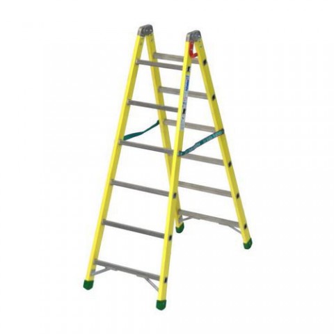 Sklolaminátový dvoudílný žebřík vhodný do provozů s vyšším rizikem elektrických výbojů. Žebřík je certifikovaný, splňuje normu EN 131 a EN 61478 v kategorii I. - 30.000 Voltů. Příčky o rozměru 30 x 30 mm s vroubkovaným povrchem. Nosné profily žebříku o rozměru 25 x 64 mm. Plastové protiskluzové patky.Sklolaminátové štafle Facal, 2 x 6 příček