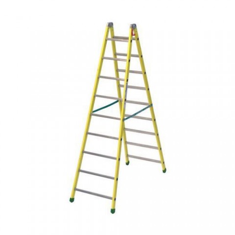 Sklolaminátový dvoudílný žebřík vhodný do provozů s vyšším rizikem elektrických výbojů. Žebřík je certifikovaný, splňuje normu EN 131 a EN 61478 v kategorii I. - 30.000 Voltů. Příčky o rozměru 30 x 30 mm s vroubkovaným povrchem. Nosné profily žebříku o rozměru 25 x 64 mm. Plastové protiskluzové patky.Sklolaminátové štafle Facal, 2 x 9 příček