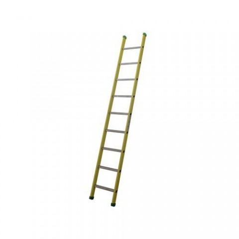 Sklolaminátový žebřík s devíti stupni vhodný do provozů s vyšším rizikem elektrických výbojů. Žebřík je certifikovaný, splňuje normu EN 131 a EN 61478 v kategorii I. - 30.000 Voltů. Příčky o rozměru 30 x 30 mm mají vroubkovaný povrch a jsou v úklonu 68 ° pro pohodlný a bezpečný nášlap. Nosné profily žebříku mají rozměr 25 x 68 mm. Plastové protiskluzové patky.Sklolaminátový žebřík Facal, 9 příček