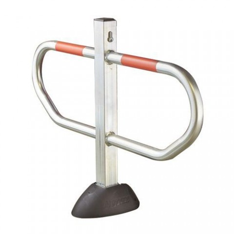 Parkovací sklopná bariéra na centrální noze s obručemi z pozinkované oceli. Základna z oceli a plastu má rozměry 16 x 23 cm a zaručuje stabilitu sloupku. Montáž k zemi pomocí šroubů. Cylindrický zámek je umístěn v horní části sloupku.Sklopná parkovací zábrana Motýlek