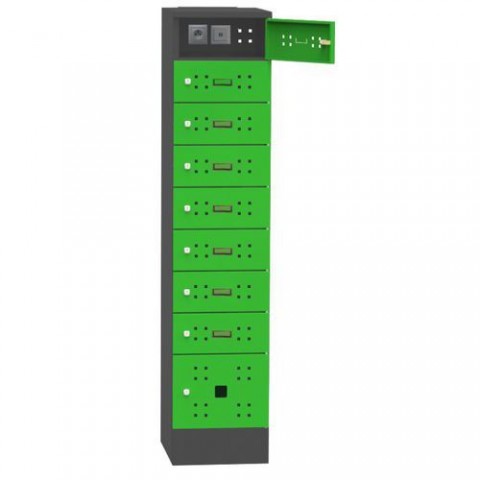 Odkládací skříň vhodná pro dobíjení telefonů, tabletů, notebooků, fotoaparátů a jiných elektronických zařízení. Každý box disponuje vlastní zásuvkou 230 V (SCHUKO) a dvěma USB porty (2.4A). Samostatná uzamykatelná servisní část s proudovým chráničem a jističem 16 A s provozní kontrolní LED. Do boxů je možné vložit notebooky o rozměru až 17''. Korpus vyrobený z ocelového plechu tl. 0,7 mm. Uzamykání jednotlivých boxů cylindrickým zámkem. Perforované dveře pro odvětrávání boxů. Plastové štítky na dveřích pro vložení jmenovky.Skříň na dobíjení mobilních zařízení Olivia, SCHUKO, USB port, 8 boxů