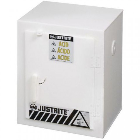 Tělo skříně je vyrobeno z několika vrstev nehořlavé sádry s izolací z minerálních vláken. V případě požáru a zvýšení okolní teploty na 50° C se aktivuje automatické zavření dveří a dojde také ke jejich bezpečnému zajištění. Veškeré mezery se utěsní speciální výplní, která teplem zvětšuje svůj objem. Takto zajištěná skříň i její obsah odolá ohni minimálně 30 minut což poskytuje dostatečnou dobu pro evakuaci osob i zásah hasičů. Dveře se otevírají i zavírají ručně a zahrnují tlumič, který nastavuje sílu potřebnou k pohybu dveří. Každé dveře s cylindrickým zámkem a indikací stavu zamknutí. Vyjímatelná záchytná vana s perforovanou vložkou pro záchyt úkapů. Vysoce reflexní štítky Haz-Alert™ varují před obsahem v jazycích EN, FR, ES a poskytují lepší viditelnost při osvětlení baterkou během požáru. Ocelové police s práškovým nástřikem lze výškově nastavit v krocích 32 mm, nosnost polic je 75 kg Přesun prázdné skříně lze paletovým vozíkem.Skříň na jedovaté látky Justrite EN, 560 x 430 x 430 mm