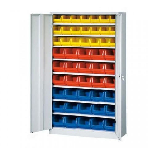 Svařovaná skříň s plastovými boxy a s dveřmi je vyrobena z kvalitního ocelového plechu. Vyztužené křídlové dveře s vnitřními závěsy mají úhel otevření 180°. Dveře jsou vybaveny bezpečnostním zámkem Ronis s cylindrickou vložkou, včetně 2 ks klíčů. Police jsou výškově nastavitelné v rastru 3,5 cm. rozměry boxu A v x š x h: 12,5 x 14,5 x 24 cm rozměry boxu B v x š x h: 16,5 x 20,7 x 34,5 cm rozměry boxu C v x š x h: 16,5 x 20,7 x 34,5 cm počet boxů: 21 x A, 15 x B, 15 x CSkříň s boxy (51 ks)