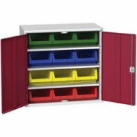 Kovové dílenské skříně vybaveny plastovými boxy pro drobnější materiál. Svařovaná ocelová konstrukce, povrchová úprava práškovým lakem. Pozinkované police s nosností 75 kg, výškově nastavitelné v rastru 25 mm. Vyztužené křídlové dveře s tříbodovým cylindrickým rozvorovým zámkem se dvěma klíči. Dodáváno včetně plastových boxů č. 5 v x š x h: 19 x 30,3 x 48,5 cm (mix barev).Skříně Bott Verso s boxy, typ č. 5