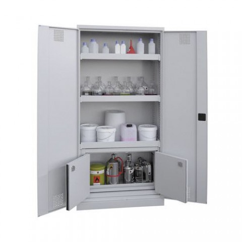 Určeno pro skladování škodlivých, vodu ohrožujících, toxických a velmi toxických kapalin, ale také pro skladování hořlavých kapalin dle EN 14470-1 / TRbF 20-L vyrobeny z vysoce kvalitní oceli, povrchová úprava - práškovým lakem světle šedá RAL 7035 součástí skříně je zabudovaný malý ohnivzdorný bezpečnostní box konstrukce skříní testována a schválena uznávaným institutem pro testování materiálů podle EN 14470-1 a na ohnivzdornost bezpečnostního boxu na dobu 30 minut nebo 60 minut schváleno z hlediska bezpečnosti GS institutem bezpečnostní box vybavený samostatným cylindrickým zámkem dveře vybaveny centrálním cylindrickým zámkem standardně vybaveny třemi vanovými policemi (každá o objemu 20l), bezpečnostní box obsahuje jednu vanovou policí (objem 11l) a automatický uzavírací mechanismus při vzniku požáru vanové police výškově nastavitelné po 25 mm, police nelze klopit a umísťovat ze šikma přípojka DN 80 pro připojení ventilátoru pro odčerpání vzduchu otvory pro ventilaci ve dveříchSkříně na chemikálie s bezpečnostním boxem